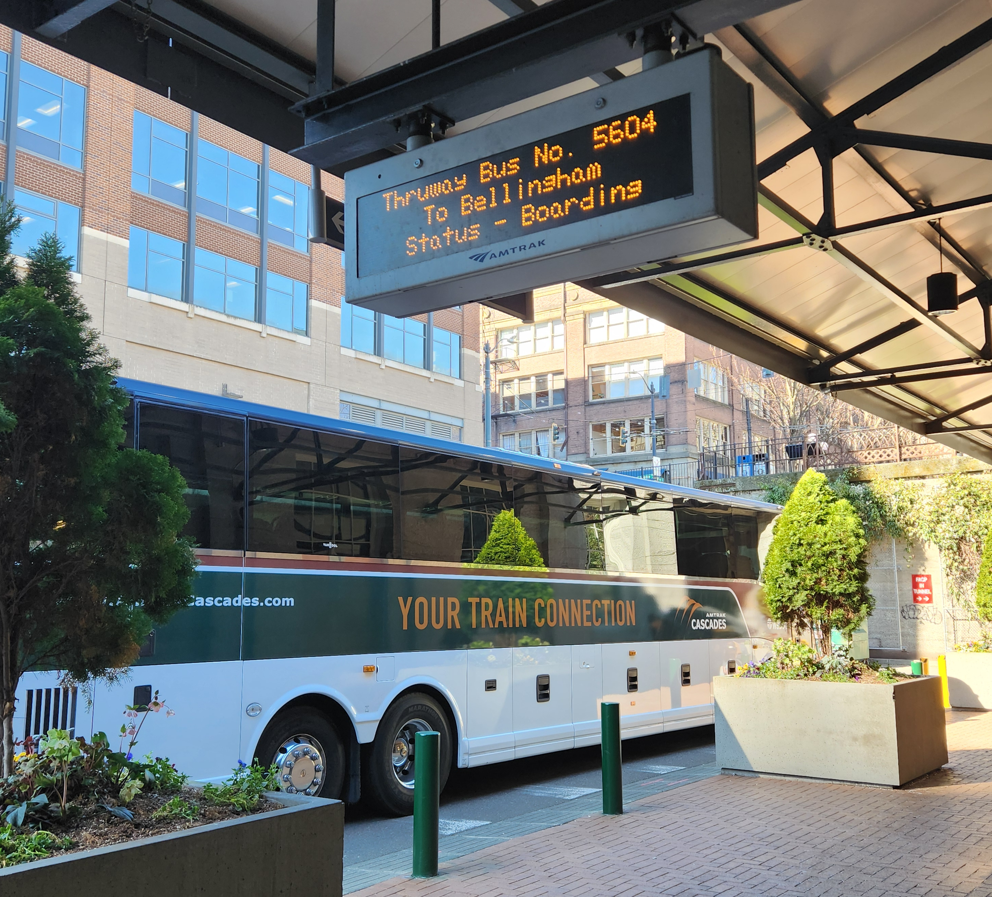 - Amtrak Cascades ridership has been steadily recovering up and down the rail corridor since the early days of the COVID-19 pandemic and the Washington State Department of Transportation has been studying ways to increase the number of roundtrip trains serving Bellingham in the years to come. In the meantime, WSDOT funds supplemental Amtrak Cascades bus service between Seattle and Bellingham, using Van Hool CX45E all-electric motorcoaches, which can run 250 miles on one charge. Since the Seattle-Bellingham zero-emission (and super quiet) buses launched in 2023, it’s not uncommon to hear some passengers say upon boarding: “This is the nicest bus I’ve ever been on.” (BhamByBus agrees.)
