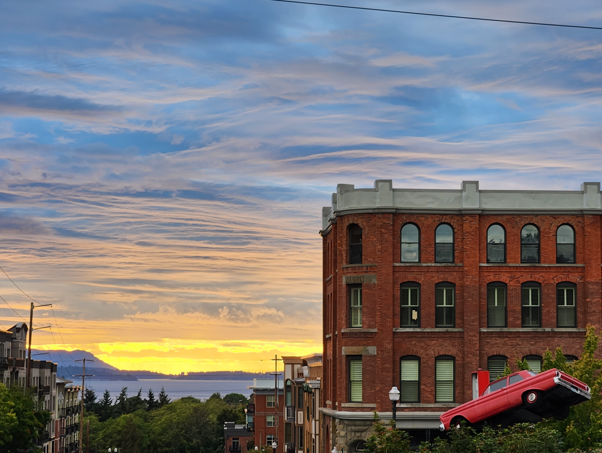 The building across the street, with the corner clocktower, was built in 2020 on the site of the former Fairhaven Hotel, an opulent Flemish Revival building constructed in 1890 in Fairhaven's headstrong boomtown days — when there were hopes that Fairhaven would be chosen as the terminus of a transcontinental railroad — before languishing as a yogurt sanitarium, having its ornate tower removed along with decorative exterior brick and stonework, and burning down in the 1950s. The new mixed-use building's corner clocktower, while not a replica of the old hotel's elegant turret, echoes what previously stood there and is an important landmark for orienting yourself within Fairhaven.