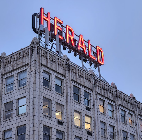 Herald Building (1155 N. State Street at Chestnut Street): One of the very few "tall" buildings on Bellingham's skyline, the Herald Building, a Late Gothic six-story building built in 1926 formerly home to The Bellingham Herald, is hard to miss thanks to its large rooftop neon "HERALD" sign. The Herald Building is home to three restaurants, Ono Kitchen & Bar (Hawaiian), Bry's Filipino Cuisine (Filipino), and Rock & Rye Oyster House (New American, seafood, and cocktails). After sunset, keep an eye out for vivid digital projections on the building's south-facing facade.