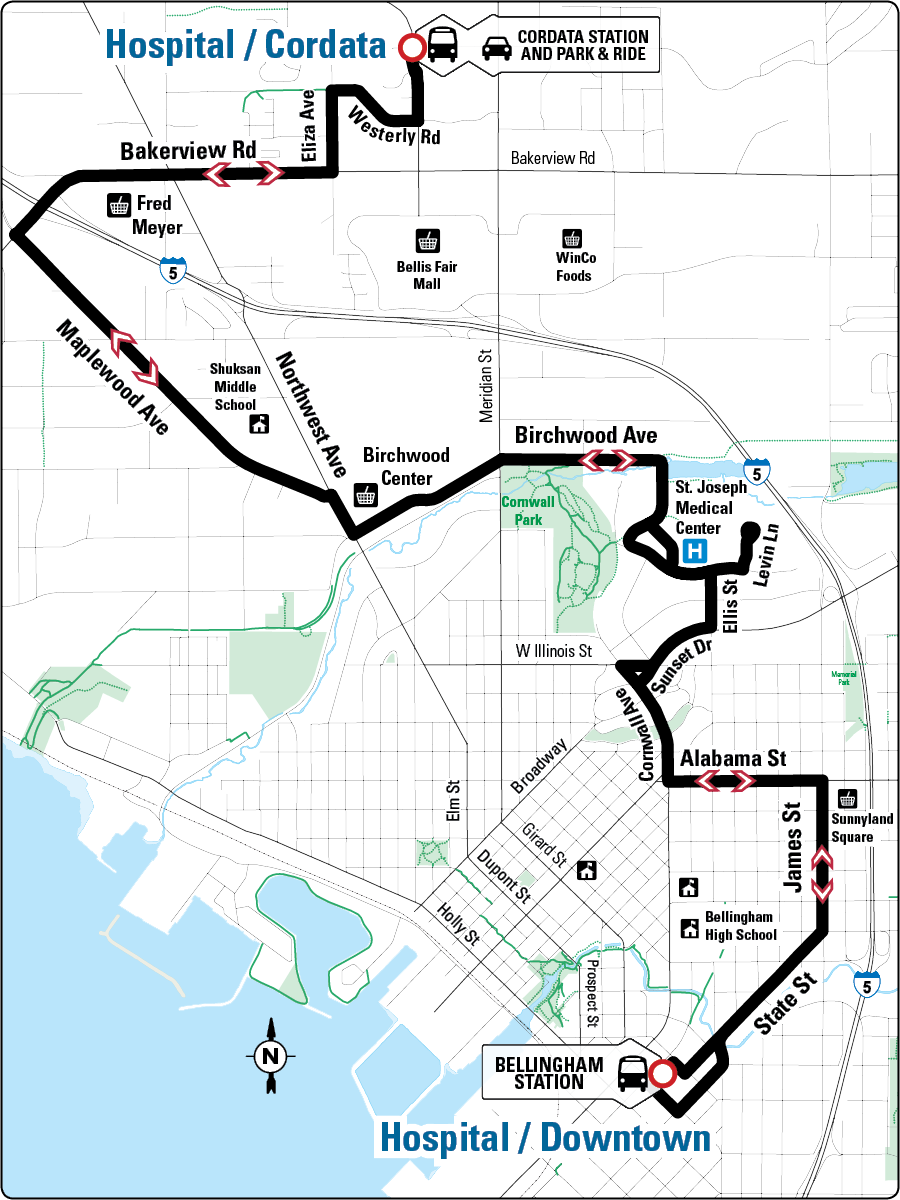 When BhamByBus moved to Bellingham, one of the eyebrow-raising discoveries about current local transit service was that PeaceHealth St. Joseph Medical Center, the only hospital in the City of Bellingham and Whatcom County, is not well served by transit. WTA’s Route 4 between Downtown Bellingham and Cordata Station via the hospital campus only sees bus service once an hour Mondays-Saturdays and lacks any Sunday bus service.